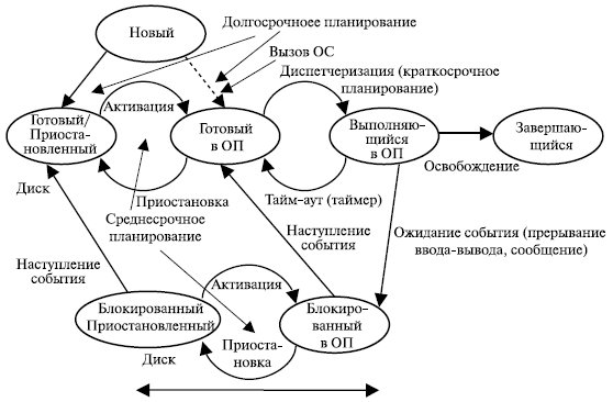 Место планирования в графе состояний и переходов процессов показано на рис. 5.9. В большинстве операционных систем универсального назначения планирование осуществляется динамически (on-line), т.е. решения принимаются во время работы системы на основе анализа текущей ситуации, не используя никаких предложений о мультипрограммной смеси. Найденное оперативно решение в таких условиях редко бывает оптимальным.
