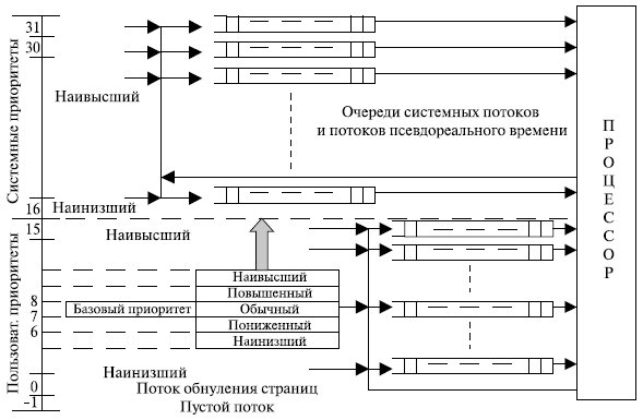 В целом, поскольку W2K использует вытесняющий планировщик с учетом приоритетов, потоки с приоритетами реального времени имеют преимущество по отношению к прочим потокам. В однопроцессорной системе, когда становится готовым к выполнению поток с более высоким приоритетом, чем выполняющийся в настоящий момент, текущий поток вытесняется и начинает выполняться поток с более высоким приоритетом.