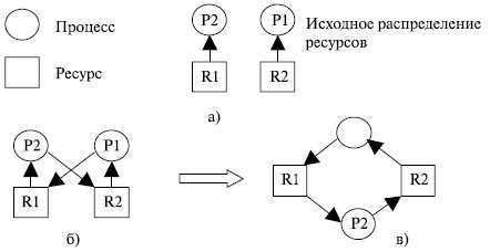 Ребро, направленное от процесса (кружка) к ресурсу (квадрату), означает, что процесс в данный момент заблокирован и находится в состоянии ожидания доступа к этому ресурсу. В нашем примере граф надо достроить, как показано на рис. 5.13 б) или в). Цикл в графе означает наличие взаимной блокировки процессов.