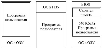 В ранних ОС управление памятью сводилось просто к загрузке программы и ее данных из некоторого внешнего накопителя (перфоленты, магнитной ленты или магнитного диска) в ОЗУ. При этом память разделялась между программой и ОС. На рис. 6.3 показаны три варианта такой схемы. Первая модель раньше применялась на мэйнфреймах и мини-компьютерах. Вторая схема сейчас используется на некоторых карманных компьютерах и встроенных системах, третья модель была характерна для ранних персональных компьютеров с MS-DOS.