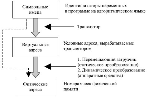 Существует два принципиально отличающихся подхода к преобразованию виртуальных адресов в физические. В первом случае такое преобразование выполняется один раз для каждого процесса во время начальной загрузки программы в память. Преобразование осуществляет перемещающий загрузчик на основании имеющихся у него данных о начальном адресе физической памяти, в которую предстоит загружать программу, а также информации, предоставляемой транслятором об адресно-зависимых элементах программы.