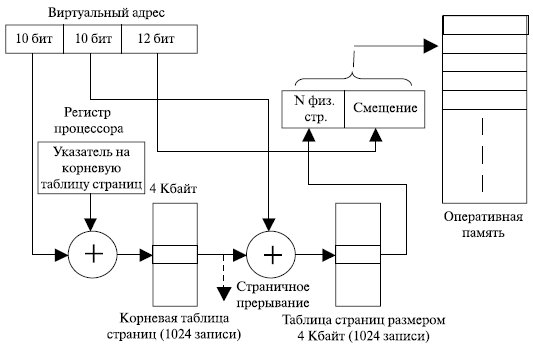 Если бит присутствия данной виртуальной страницы не установлен, это означает, что искомой страницы в оперативной памяти нет. В этом случае процессор генерирует сигнал страничного прерывания, активизирующий операционную систему, которая загружает требуемую страницу в оперативную память и обновляет таблицу страниц.
