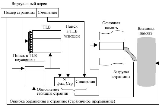 Получив виртуальный адрес, процессор просматривает TLB. Если требуемая запись найдена, процессор получает адрес физической страницы и формирует реальный адрес. Если запись в TLB не найдена, то процессор берет номер виртуальной страницы в качестве индекса для таблицы страниц процесса и просматривает соответствующую запись. Если бит присутствия в ней установлен, значит, искомая страница находится в основной памяти, и процессор получает номер физической страницы из записи таблицы страниц, а затем формирует реальный физический адрес. Одновременно вносится использованная запись таблицы страниц в TLB.