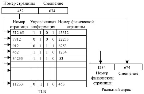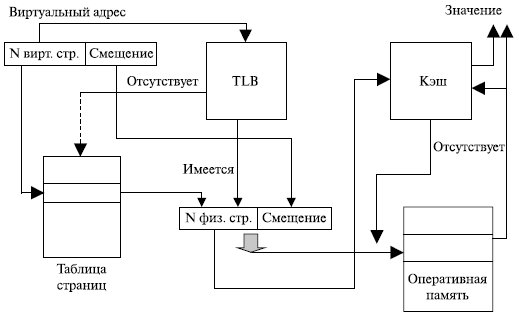 - использование специального высокоскоростного кэша для хранения части записей таблицы страниц, который обычно называют буфером быстрого преобразования адреса, или буфером поиска трансляции (translation lookaside buffer – TLB);