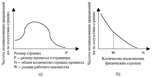 Проблема выбора размера страницы усложняется еще и тем, что размер страницы влияет и на частоту возникновения прерывания из-за отсутствия страницы в основной памяти. На рис. 6.16 а) показан примерный график изменения частоты страничных прерываний из-за отсутствия страницы с учетом принципа локализации. Если размер страницы очень мал, в памяти размещается относительно большое число страниц процесса. Через некоторое время страницы в памяти будут содержать части процесса, сосредоточенные вблизи последних обращений, и частота прерываний из-за отсутствия страницы должна быть невелика.