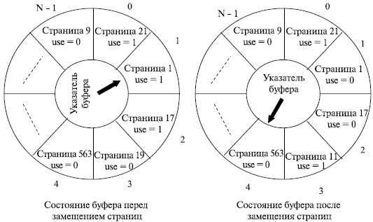 При замещении страницы указатель перемещается к следующему кадру в буфере. Когда наступает время замещения страницы, ОС сканирует буфер для поиска кадра, бит использования которого равен 0. При этом когда в процессе поиска встречается кадр с битом использования, равным 1, он сбрасывается в 0. Первый же встречный кадр с нулевым битом использования выбирается для замещения. Если все кадры имеют бит использования, равный 1, указатель совершает полный круг и возвращается к начальному положению, заменяя страницу в этом кадре. Буфер кадров страниц представлен в виде круга, напоминающего часы, откуда и произошло название стратегии.