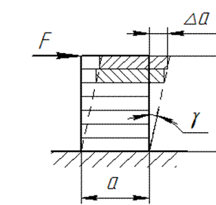 Пусть на вертикальную жестко заделанную у основания балку действует некоторая сила F (Рис. V.1). При этом слои материала пытаются сдвинуться, чем обусловлено появлением деформаций сдвига. Угол сдвига γ мал, вследствие чего мы можем принять его равным тангенсу γ, который определяется: