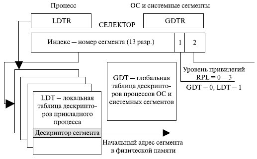 В каждый момент времени в специальных регистрах GDTR и LDTR хранится информация о местоположении и размерах глобальной таблицы GDT и активной таблице LDT. Регистр LDTR указывает на расположение сегмента LDT в оперативной памяти косвенно – он содержит индекс дескриптора в таблице GTD, в котором содержится адрес таблицы LDT и ее размер.