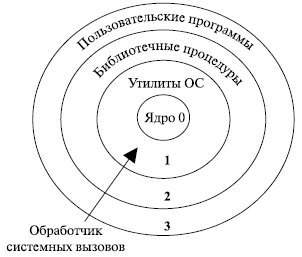 Поле из двух битов селектора задает требуемый уровень привилегий, и используется механизм защиты. В системах на базе микропроцесса Pentium поддерживается 4 уровня защиты, где уровень 0 является наиболее привилегированным, а уровень 3 – наименее привилегированным. Эти уровни образуют так называемые кольца защиты (рис. 6.23).