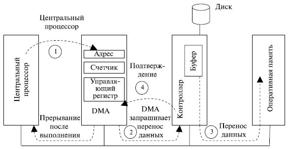 - Прямой доступ к памяти (direct memory access – DMA). В этом случае специальный модуль прямого доступа к памяти управляет обменом данных между основной памятью и контроллером ввода-вывода. Процессор посылает запрос на передачу блока данных модулю прямого доступа к памяти, а прерывание происходит только после передачи всего блока данных.