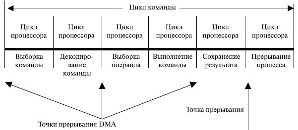 Ниже на рис. 7.2 показана позиция цикла команд, в которых работа процессора может быть приостановлена. В любом случае приостановка процессора происходит только при необходимости использования шины. После этого устройство DMA выполняет передачу слова и возвращает управление процессору. Однако это не является прерыванием: процессор не сохраняет контекст с переходом к выполнению другого задания. Он просто делает паузу на время одного цикла шины.