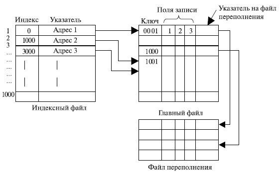 Индексно-последовательный файл. Одним из методов преодоления недостатков последовательного файла является индексно-последовательная организация файла. В этом случае файл состоит из трех частей (файлов): главный файл, содержащий записи с последовательно идущими ключами, индексный файл, содержащий индексное поле, и указатель в главный с ключами, файл переполнения (рис. 7.10).