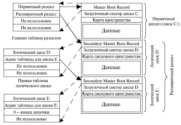 Разделы дисков могут быть двух типов: первичные (primary) и расширенные (extended). Максимальное число первичных разделов равно четырем. Из них только один может быть активным. Именно загрузчику, расположенному в активном разделе, передается управление при включении компьютера с помощью внесистемного загрузчика. Согласно принятым спецификациям на одном жестком диске может быть только один расширенный раздел, который может быть разделен на логические диски (рис. 7.13). Расширенный раздел содержит вторичную запись MBR, в состав которой вместо таблицы разделов входит аналогичная ей таблица логических дисков (logical Disks Table, LDT). Эта таблица описывает размещение и характеристики раздела, содержащего единственный логический диск, а также может специфицировать следующую запись SMBR (Secondary MBR).