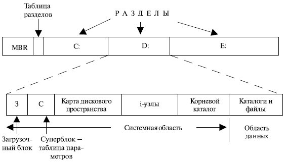 Представление пользователей о файловой системе как об иерархически организованном множестве информационных блоков имеет мало общего с порядком хранения файлов на диске. Файл, имеющий образ цельного, непрерывающегося набора байт, на самом деле разбросан своими частями по всему диску, причем это разбиение никак не связано с логической структурой файла. Точно так же логически объединенные файлы из одного каталога совсем не обязательно соседствуют на диске. Принципы размещения файлов, каталогов и системной информации на реальном устройстве описываются физической организацией файловой системы. При этом ясно, что разные файловые системы имеют разную физическую организацию.