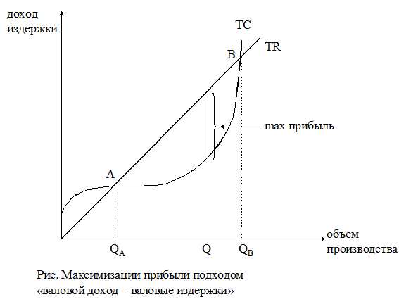 Максимизация прибыли подходом «валовой доход – валовые издержки» (рис.). Прибыль будет получена фирмой тогда, когда валовой доход (TR) превысит общие издержки (TC) - отрезок АВ. Точки А и В - точки критических объемов производства, когда валовой доход равен общим издержкам. До точки А и после точки В совокупные издержки превышают совокупный доход (TC > TR), такое производство экономически убыточно. В интервале производства от QA до QB фирма получает прибыль, максимальная величина которой будет достигнута при выпуске, равном Q (TR – TC → max).