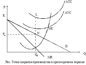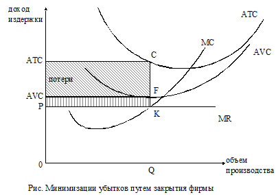 Минимизация убытков. В краткосрочном периоде у фирмы бывают ситуации, когда при существующей рыночной цене валовой доход (TR) не покрывает общие издержки (TC). В этом случае перед фирмой стоит задача минимизировать убытки.