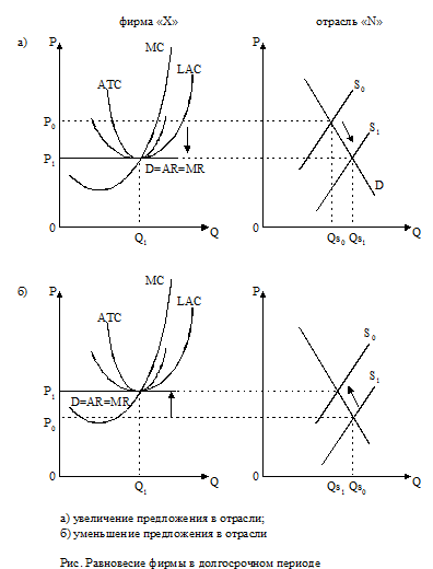 В долгосрочном периоде складывается иная ситуация. В условиях монополистической конкуренции равновесие отдельной фирмы отрасли наступает тогда, когда цена продаваемого товара (т.е. величина среднего дохода) сравняется с величиной средних общих издержек, что обеспечит безубыточность фирмы, получение ею нормальной прибыли. Равновесие достигается в точке, где MR = МС, при этом величина средних общих издержек равняется цене (величине среднего дохода). Такое состояние равновесия фирмы может быть достигнуто не только потерей (увеличением) своей доли реализации за счет вступления (оттока) фирм, т.е. сдвигом кривой общего спроса, но и изменением в долгосрочном периоде средних и предельных издержек. Несмотря на то, что в долгосрочном периоде основное количество фирм будет иметь нормальную прибыль, отдельные из них могут получать и небольшую экономическую прибыль в силу того, что несут меньшие издержки при высокой дифференциации и разнообразии своей продукции.