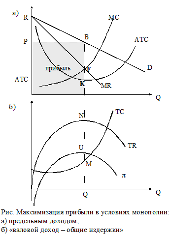 Прибыль монополиста определяется площадью прямоугольника РВК(АТС). Максимизация прибыли методом «валовой доход - общие издержки» приведена на рис. Значение величины валового дохода превышает величину издержек на максимальную величину (отрезок NM) при выпуске, равном Q. Прибыль π при таком выпуске максимальна и равна отрезку QU. Значение прибыли вначале (при очень малом выпуске) может быть и отрицательным, поскольку фирма может нести убыток, равный своим постоянным издержкам. Прибыль растет одновременно с объемом производства и достигает максимального значения в точке U.