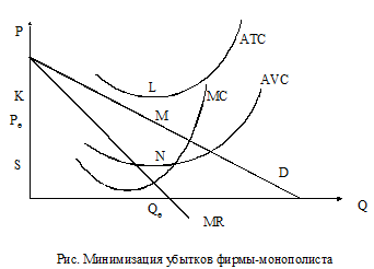 Производство будет прекращено, а фирма-монополист понесет убытки в размере издержек на рисунке площадь прямоугольника KLNPE.