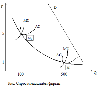 При некоторых условиях существование только одной, а не нескольких фирм в отрасли более отвечает общественным интересам. Чаще всего это бывает обусловлено такими особенностями технологии, при которых только крупномасштабное производство является рентабельным. В этих отраслях положительный эффект масштаба можно реализовать в полной мере, лишь приблизив размеры предприятия к уровню рыночного спроса на продукцию отрасли. Как показано на рис., общественный спрос могут удовлетворить как несколько малых фирм, так и одна крупная фирма. Однако долгосрочные средние издержки производства будут наименьшими при оперировании в отрасли одной фирмы-монополиста. Таким образом, фирма, реализующая значительный положительный эффект масштаба, может быть названа естественной монополией. Ее значение для общества состоит в минимизации издержек производства.