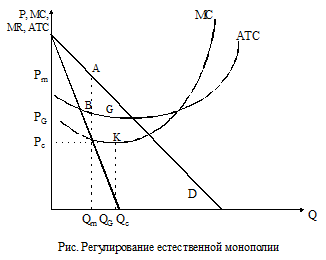 Большинству чисто монополизированных отраслей в российской экономике присущи черты естественной монополии. Государство осуществляет прямое или косвенное регулирование их деятельности. На рис. приведен порядок государственного регулирования естественной монополии. При отсутствии регулирования фирма-монополист выберет объем производства Qm и цену, равную Рm, получая при этом прибыль с каждой единицы продукции, равную превышению цены над средними издержками (отрезок АВ).