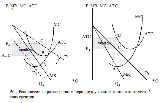 Так как цена РА превышает средние общие издержки АТС, то фирма получает экономическую прибыль, обозначенную заштрихованным прямоугольником. В силу того, что серьезные барьеры для вступления в отрасль отсутствуют, прибыль будет привлекать в отрасль новых монополистических конкурентов. В результате общий спрос рынка распределится на все большее количество фирм, поэтому кривая спроса для отдельной фирмы может переместиться влево, занимая положение D1. При этом, если величина средних общих издержек превышает цену, то фирма понесет убыток и покинет отрасль. Таким образом, в краткосрочном периоде поведение фирм в условиях монополистической конкуренции зависит от наличия прибыли. Получение прибыли привлекает в отрасль новые фирмы с конкурирующими товарами, убыток побуждает их уходить из отрасли.