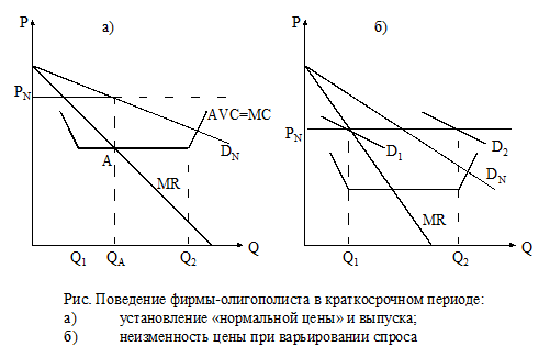 Олигополист, как и другие фирмы несовершенной конкуренции, максимизирует свою прибыль, когда соблюдается равенство MR=MC, при этом кривые AVC и МС совпадают. Значения цены PN и объема выпуска QA находятся по точке А, на пересечении MR и МС (AVC).