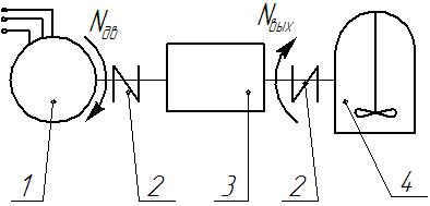 В биомеханике вращательное движение практически не встречается, в основном преобладают возвратно-поступательные механизмы с шарнирными сочленениями. В технике вращательное движение используется весьма широко, а именно – при передачи механической энергии (движения) от двигателя к исполнительному органу машины или прибора, а так же для преобразования видов движения, моментов и усилий в передаточных механизмах (устройствах). Примером передаточного механизма может послужить привод механического перемешивающего устройства (Рис. IX. 1), состоящий из двигателя 1, передаточного устройства 3 и исполнительного механизма 4 со своим рабочим органом, соединенных с помощью муфт 2.