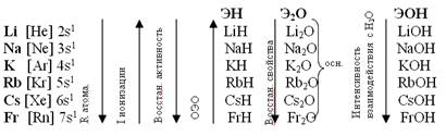 Энергия ионизации– это та энергия, которую необходимо затратить на отрыв внешнего электрона у невозбужденного атома. Строение внешних оболочек ns1, поэтому они имеют низкие энергии ионизации, уменьшающиеся при переходе по подгруппе сверху вниз. Связь электрона с ядром ослабевает при этом за счет увеличения радиуса атома и экранирования заряда ядра предшествующими внешнему электрону оболочками, увеличивается расстояние электрона от ядра и энергия ионизации уменьшается.