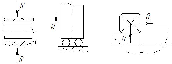 Опора вала – базовый элемент расположения всех вращающихся деталей машины. По своему назначению подшипники подразделяются на опорные, воспринимающие радиальную нагрузку R (Рис. XI. 1, а), осевые, обеспечивающие осевую реакцию Q (Рис. ХI. 1, б), и опорно-упорные (или радиально-осевые), обеспечивающие реакции как радиальные R, так и осевые Q (Рис. ХI. 1, в).