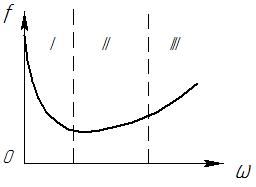 Режим сухого трения (зона I) характеризуется малыми ω, при этом цапфа и вкладыш подшипника находятся в непосредственном контакте – коэффициент трения f принимает наибольшее значение. Увеличение ω приводит к увеличению масляного слоя между контактирующими поверхностями (зона II), в связи с чем наблюдается резкое уменьшение трения f – режим полужидкостного трения. Начиная с некоторой угловой скорости ω = ωкр, при которой коэффициент трения принимает наименьшее значение f = fmin, вал отходит от подшипника (всплывает). Последующее увеличение угловой скорости (зона III) приводит к увеличению масляного слоя между валом и вкладышем подшипника, что приводит к увеличению трения – режим жидкостного трения.