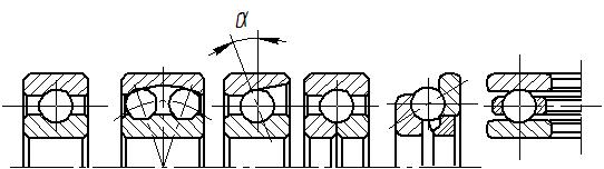 По форме тел качения подшипники подразделяются на шариковые (Рис. ХI. 7) и роликовые (Рис. ХI. 8). Последние, в свою очередь, делят по форме роликов на подшипники с короткими (Рис. ХI. 8, а) и длинными (Рис. ХI. 8, д) цилиндрическими роликами, с коническими (Рис. ХI. 8, г), бочкообразными (Рис. ХI. 8, б) и игольчатыми (Рис. ХI. 8, в) роликами.