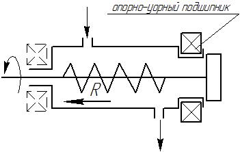 Основной задачей при конструировании машины является определение положения упорного подшипника. В случае, если подшипник поставить в начале вала, то под действием реактивной силы R вал при вращении будет сжиматься, что может привести к изгибу вала. Если шнек изогнется, то коснется корпуса транспортера. Поэтому рациональнее опорно-упорный подшипник размещать в конце трассы перемещения, тогда вал подвергается растяжению, а не изгибу.