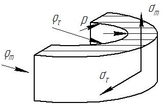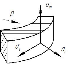 Расчет корпуса аппарата выполняется на прочность и устойчивость. Расчет на прочность заключается в определении толщины стенки обечайки корпуса при воздействии на него внутреннего давления р. В теории оболочек рассматриваются оболочки толстостенные и тонкостенные. В металле толстостенной оболочки при действии внутреннего давления р работают напряжения меридиональные σт, касательные στ и радиональные σr (Рис. XIV. 3).