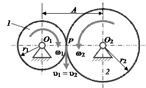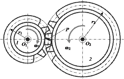 Катки, на рабочих поверхностях которых расположены зубья и впадины, называются зубчатыми колёсами. Два сцеплённых зубчатых колеса образуют зубчатую передачу. Кривые, ограничивающие боковые поверхности зубьев, называют их профилями; два касающихся друг друга профиля называют сопряжёнными профилями. Оба профиля, как правило, образованы одинаковыми кривыми. Если образующие боковых поверхностей зубьев параллельны оси вращения, то зубья называют прямыми, а передачу – прямозубой. Зубчатые механизмы находят самое широкое применение в машинах и приборах. На рис. 3 показан трёхзвенный зубчатый механизм, состоящий из круглых цилиндрических колёс 1 и 2. Это механизм с внешним зубчатым зацеплением. Угловые скорости w1 и w2 колёс 1 и 2 этого механизма имеют разные знаки. У механизмов с внутренним зубчатым зацеплением угловые скорости w1 и w2 колёс 1 и 2 имеют одинаковые знаки. Окружности радиусов r 1, r 2 называются начальными окружностями. Профили зубьев подбираются из условия, чтобы нормаль в их точке касания всегда проходила через постоянную точку P – мгновенный центр вращения в относительном движении колёс 1 и 2.