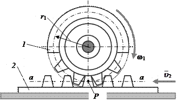 Колесо 1 имеет начальную окружность радиуса r 1, а рейка 2 – начальную прямую a – a. Точка P является мгновенным центром вращения в относительном движении звеньев 1 и 2. Скорости w1 и