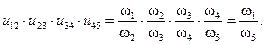 Рассмотрим рядовое соединение, состоящее из пяти колёс. Входное зубчатое колесо 1 через промежуточные колёса передаёт вращательный момент (мощность) выходному колесу 5. Определим передаточное отношение для каждой пары колёс. Имеем