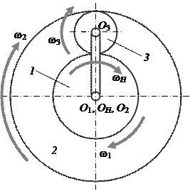 вращаются с угловыми скоростями w1, w2 и w Н. Число степеней свободы W этого механизма равно двум. В этом механизме число подвижных звеньев n = 4, число вращательных пар V класса p 5 = 4. то три пары O 1, O 2 и OH, в которые входят звенья 1, 2 и H со стойкой, и пара O 3, в которую входит водило H и звено 3. Число пар IV класса p 4 = 2. Это входящие в зацепление колёса 1, 3 и 3, 2. Следовательно, по структурной формуле число W степеней свободы механизма