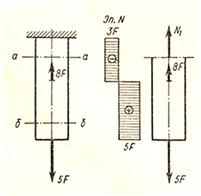 Проведем какое-нибудь сечение, например а– а, и рассмотрим равновесие нижней отсеченной части. Воздействие верхней отброшенной части на нижнюю заменим продольной силой и предварительно направим ее от сечения, т.е. предположим, что сила является растягивающей. Составим уравнение равновесия. Проецируя все силы, действующие на нижнюю часть, на направление параллельное оси стержня, и приравнивая сумму проекций нулю, получаем N1+8F– 5F=0, откуда N1= –3F.