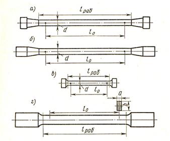 Применяют как цилиндрические образцы диаметром 3мм и более (рис. 1, а, б, в), так и плоские (рис. 1, г) толщиной 0,5 мм и более с начальной расчетной длиной l0 =5,65A1/2 или l0 = 11,3A1/2. В первом случае образцы называюткороткими, во втором —длинными.