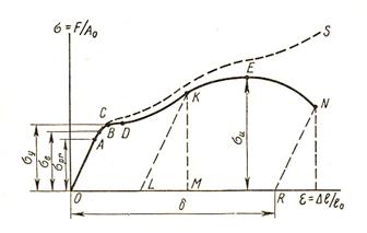 Для того чтобы модно было сравнивать результаты испытания образцов различных размеров, изготовленных из одинаковых материалов, диаграмму растяжения перестраивают и изображают в другой системе координат: по оси ординат откладывают значение нормального напряжения в поперечном сечении растягиваемого образца σр=F/А0, где A0 — первоначальная площадь сечения образца, а по оси абсцисс откладывают относительные удлинения образца ε= Δ l/ l0, где l0 — его первоначальная длина.