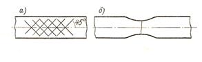 Как показывают исследования образцов стали, текучесть сопровождается значительными взаимными сдвигами кристаллов, в результате чего на поверхности образца появляются линии (так называемые линии Людерса — Чернова), наклоненные к оси образца под углом примерно 45° (рис. 3, а).