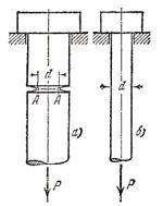 Рассмотрим стержень с выточкой, представленный на рис.1, а. Можно показать, что при растяжении такого стержня напряжения в точках А, расположенных у вершины выточки, будут заметно больше, чем для гладкого стержня, растянутого теми же силами (рис. 1, б).