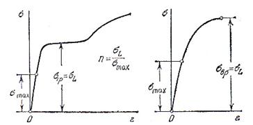 Для того чтобы избежать в работающей конструкции образования заметных остаточных деформаций,за величину σL для пластичных материалов принимается обычно предел текучести. Тогда наибольшее рабочее напряжение составляет n-ю долю от σт (рис. 2). Коэффициент в этом случае обозначается через n т и называется коэффициентом запаса по текучести. Для хрупких, а в некоторых случаях и для умеренно пластичных материалов за σL принимается предел прочности σвр. Тогда получаем