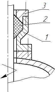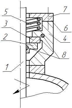 Особенность торцевых уплотнений заключается в их самоцентровке и притирания без внешнего поджатия. Уплотнение снабжено вращающимся колесом 2 на валу 1, соединенных с натягом, запрессованное в обойму 4 графитовым (графит может быть заменен пирографитом или углефторопластом) колесом 3, упруго поджатым пружиной 5, крышкой 6 и шпилечным соединением 7. Достоинством графита является его способность притираться к ответному торцу, тогда при малом коэффициенте трения между графитом и стальным шлифованным кольцом 3 обеспечивается герметичность. Иногда, для полной надежности уплотнительного узла, торцевые уплотнения снабжаются дополнительными колечками 8.
