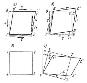 Рассмотрим теперь деформации при сдвиге. Элемент КВСD, прямоугольный до деформации (рис. 3, а), после деформации сдвига примет вид КВ'С'D (грань КD считаем закрепленной).