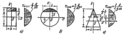 и эпюра касательных напряжений по высоте сечения изображается квадратной параболой. Наибольшее напряжение имеет место при