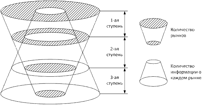 На 1 ступени имеется большое количество рынков и самая общая информация о каждом из них. На этой ступени отсеиваются заведомо неприемлемые рынки (страны). С каждой последующей ступенью отбора количество рынков уменьшается, а количество информации о каждом из них становится больше.