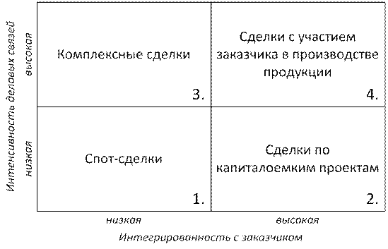 2. Сделки по капиталоемким проектам. Интегрированность с заказчиком высокая, интенсивность деловых связей может быть низкой (турбины для ГЭС, реакторы для АЭС, комплексы для КЛА).