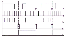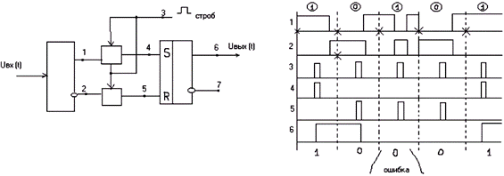 Схема состоит из входного устройства, двух ключей и RS-триггера. Входное устройство имеет два выхода на один транслируется входной сигнал без изменений, а на другой с инверсией (точки 1 и 2). Стробирующие импульсы открывают ключи на время своего существования. Через ключи высокий потенциал поступает на один из входов тригера и переводит его в соответствующее состояние. Последовательность 4 – устанавливает триггер в “1”, а 5 – сбрасывает триггер в “0”.